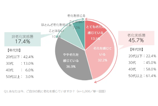 特に40代では6割近くが、50代以上では6割以上が老化を実感しています。